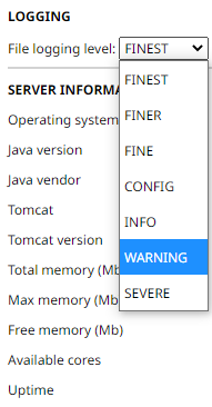 1. The current set level (e.g., FINEST) is displayed. To change, click the drop-down list and select another log level.
