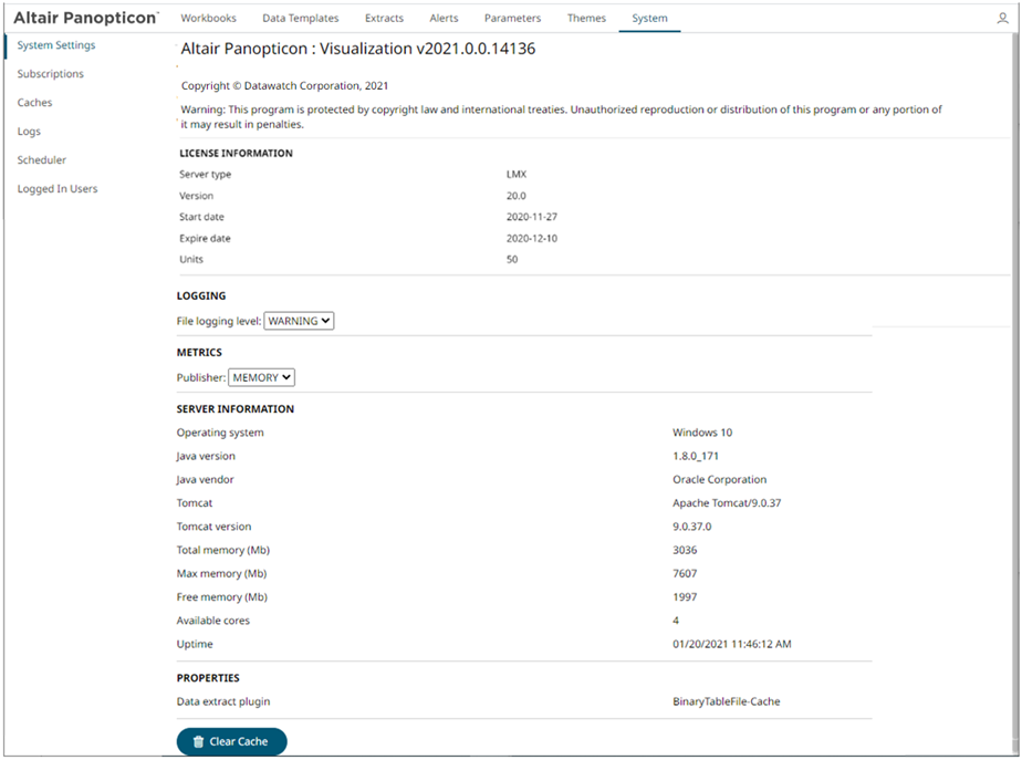 If the licensing used is the volume-based XML file (named DatawatchLicense.xml), the content and location (i.e., c:\vizserverdata) of the license are displayed.
