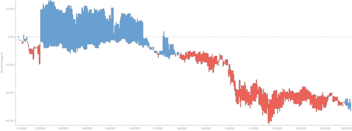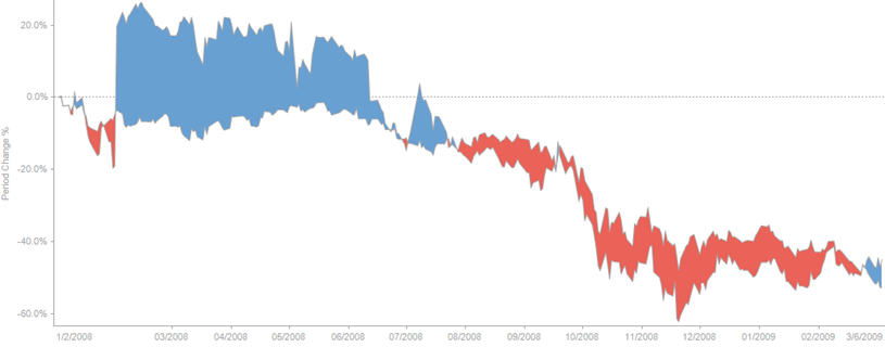 The Spread Graph displays the variance or spread between two time-based data series.