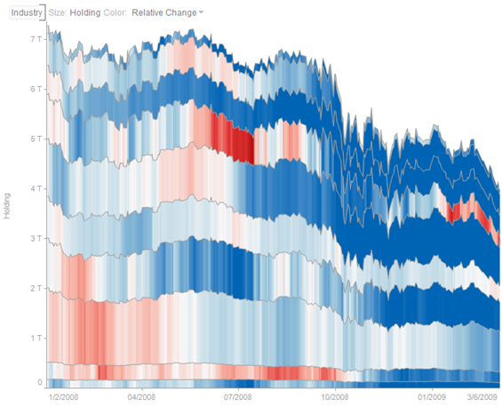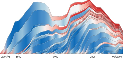 Stack Graphs let you visualize quantitative changes to several data sets over time, and you can see how each data point contributes to the total. As with the Treemap the Height of the stack relates Importance, while the color relates Urgency or variance.