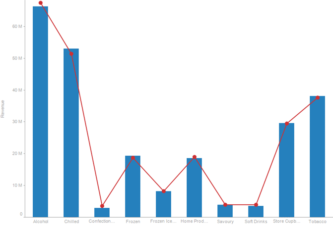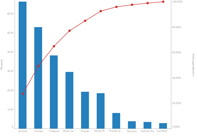 A common usage of the Pareto chart is to compare actual values to forecast/target values, with the actuals being displayed as the bar, and the forecast as the line. In this scenario, typically both measures are bound to the left Y axis, so that they have comparable scales.