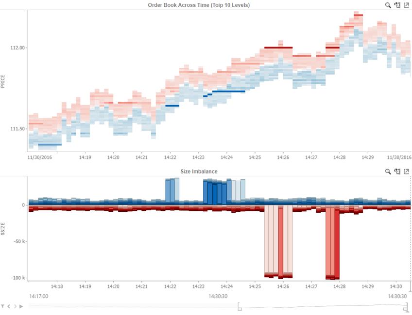 Figure 2-17. A needle graph with full width needles in combination with an Order Book graph.