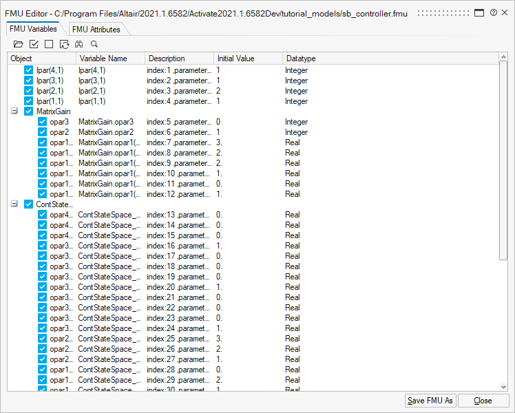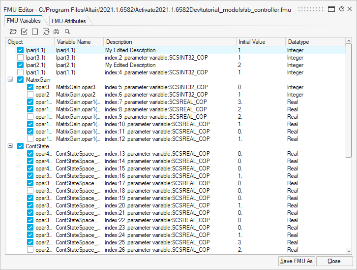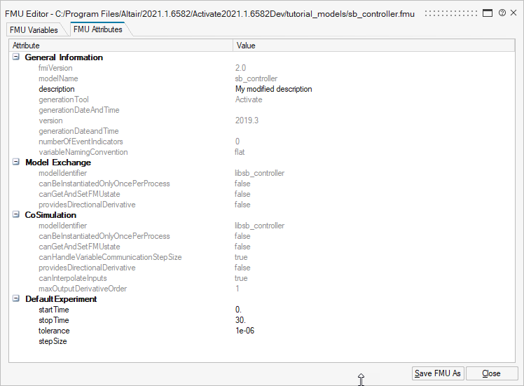 The FMU Editor lets you interact within the hierarchy of an FMU, hide or expose variables and attributes to customize information for a particular audience, and save and export a customized FMU.