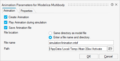 The Animation Parameters for Modelica Multibody dialog appears: