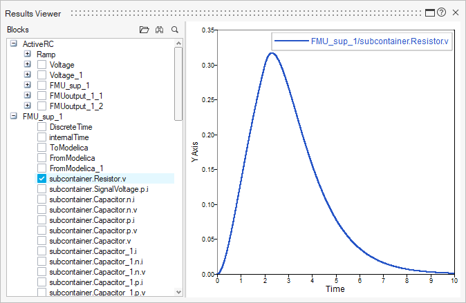 The Results Viewer lets you display the values of all blocks, including the Modelica blocks. Since Modelica blocks are processed by the Modelica Compiler, they appear in the Blocks pane of the Results Viewer in a branch starting with the prefix FMU_.