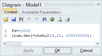 2. On the Context tab, enter the command: [num,den]=cheby2(3,20,2000/5000);