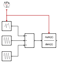 5. Connect the blocks so that the sine wave with additive noise passes through the digital low pass filter implemented with a discrete transfer function: