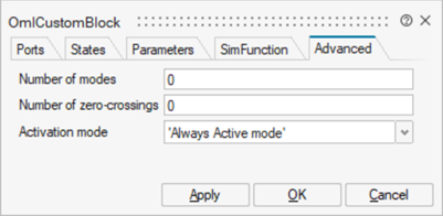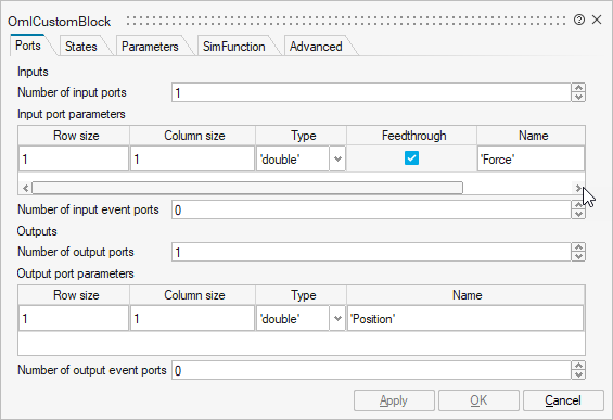 Define the ports, states, parameters, and simulation function for the OML Custom Block.