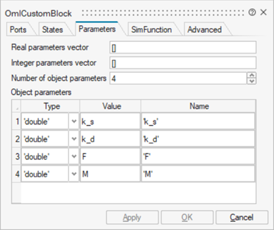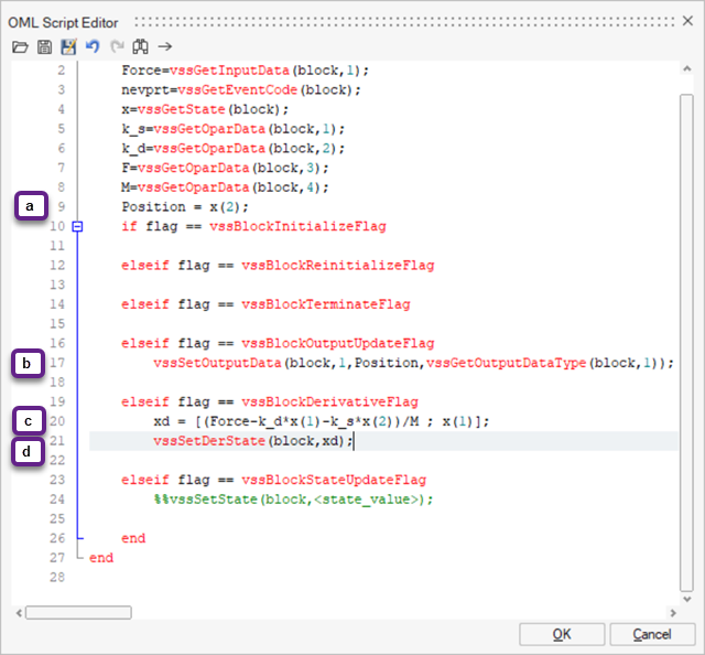 Flag/API Description Applied in this tutorial Force=vssGetInputData(block,1);vssGetInputDatais called to define the Force variable as equal to the block's signal input.Yes nevprt=vssGetEventCode(block);GetEventCodeis called to define the variable nevprt as equal to the block's event input (none in this case).Yes x=vssGetState(block);GetStateis called to define the variable x as equal to the given block states.Yes k_s=vssGetOparData(block,1);GetOparDatais called to define the the variable k_s as equal to the given Object Parameter 1 that is defined in the Parameters tab.Yes k_d=vssGetOparData(block,2);GetOparDatais called to define the the variable k_d as equal to the given Object Parameter 2, which is defined in the Parameters tab.Yes F=vssGetOparData(block,3);GetOparDatais called to define the variable F as equal to the given Object Parameter 3, which is defined in the Parameters tab.Yes M=vssGetOparData(block,4);GetOparDatais called to define the the variable M as equal to the given Object Parameter 4, which is defined in the Parameters tab. The API is also called to enable the calculation ofPosition = x(2);Yes if flag == vssBlockInitializeFlagThis flag is called at the start of a simulation to allocate memory, or to open a file or channel. No elseif flag == vssBlockReinitializeFlagThis flag is used mainly with continuous blocks for updating states based on a defined input. For example, the block can be called by the simulator during the initialization phase to find the steady state of a system. No elseif flag == vssBlockTerminateFlagThis flag is called only once at the end of a simulation if the block requires final tasks such as clearing variables, exporting, or organizing information once the block execution has finished. No elseif flag == vssBlockOutputUpdateFlagThis flag is called to compute the outputs during a simulation and is called every time the block is activated. In this tutorial, the Output that is triggered is defined with vssSetOuputData.Yes vssSetOutputData (block,1,Position,vssGetOutputDataType(block,1));vssSetOutputDatais called to define the output.Yes vssGetOutputDataTypeis is called to assign a data type to the output signal.Yes elseif flag == vssBlockDerivativeFlagxd = [(Force-k_d*x(1)-k_s*x(2))/M ; x(1)];vssSetDerState(block,xd);This flag is called to apply a computation to the system, which in this tutorial is the equation of motion ( xd = [(Force-k_d*x(1)-k_s*x(2))/M ; x(1)];). The APIvssSetDerStateis then called to set the derivative state equal to the system's velocity that was solved in the equation of motion.Yes elseif flag == vssBlockStateUpdateFlagThis flag is called for the blocks that have states to update the states. This flag is called every time that a block is activated. No
