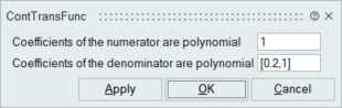 2. On the block, ContTransFunc, double-click. In the block dialog, for Coefficients of the numerator polynomial, enter: 1. For Coefficients of the denominator polynomial, enter: [0.2 1], and click OK.