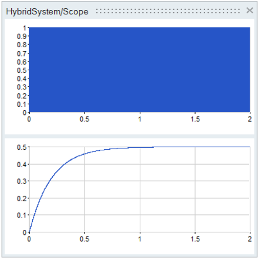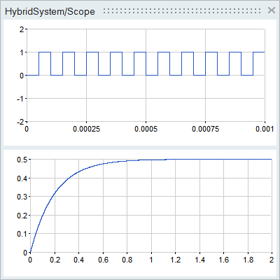 A Scope window opens. Because the Scope block is defined with two inputs, two corresponding subplots are displayed, representing the square wave signal and system response, respectively. Because the frequency of the square wave is 10,000Hz, too many periods exist in the time span between 0 and 2 seconds, therefore zooming into a smaller range is required.