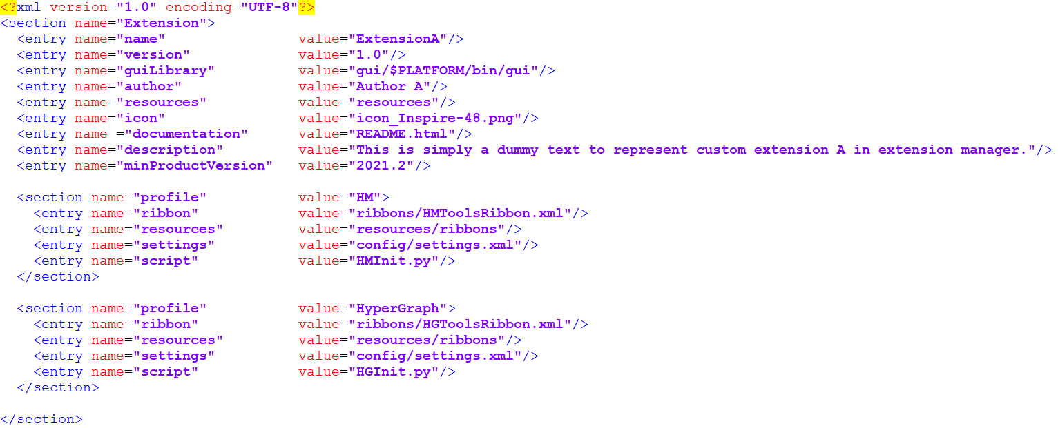 As defined in the previous code example, if the HyperMesh profile in Hyperworks loads a certain extension, the Extension Manager executes, for example, HMInit.py. Also if the profile is switched to HyperGraph, the Extension Manager does not unload the given extension.
