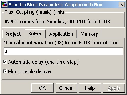 | Minimal input variation (%) to run FLUX computation | Permet de définir un pourcentage de variation des paramètres en entrée (entre 2 pas de calcul) en dessous duquel le calcul Flux ne sera pas réalisé. L'intérêt est de pouvoir effectuer plusieurs pas de temps Simulink, sans systématiquement réaliser un calcul FLUX. |