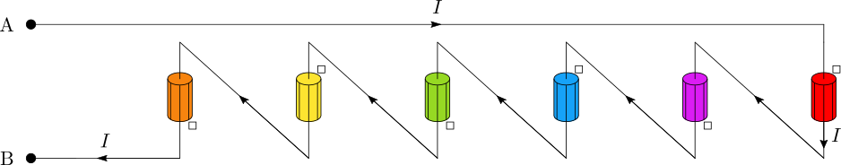 | Symétries et périodicités : conducteurs en série ou en parallèle | Circuit équivalent de l'association entre les conducteurs |