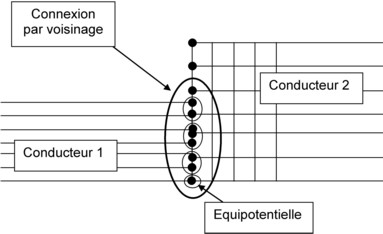 Elle prévoit un ou plusieurs nœuds pour le circuit équivalent PEEC dans le sens qu'une ou plusieurs connexions équipotentielles sont établies entre les éléments du maillage des conducteurs impliqués, comme montré dans la figure ci-dessous.