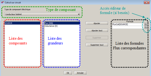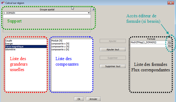 - Pour valider définitivement le calcul l’utilisateur doit valider cette boite de dialogue principale en cliquant sur Calculer (mais il est possible d’ajouter d’autres grandeurs de type Région, Circuit ou Ensemble mécanique)