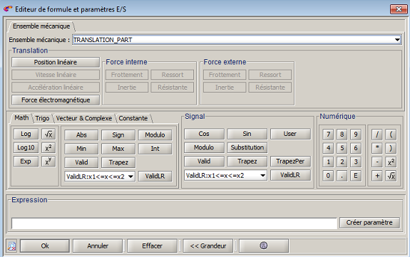 En cliquant sur Ensemble mécanique, la boite Editeur de formule et paramètre E/S (déjà existante) s'ouvre directement, sans passer par une nouvelle boite de dialogue intermédiaire comme c'est le cas pour Région et Circuit . Celle-ci contient les grandeurs globales associées à l'ensemble mécanique (position, vitesse, force…)