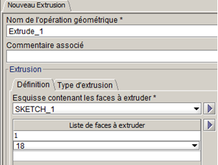 - L'opération EXTRUDE_1 a été ajoutée dans la liste des opérations géométriques liées à l'objet OBJ_EXTRUDE_1 (ainsi que SWEEP_ASSEMBLY si les faces extrudées n'appartiennent pas à une esquisse)