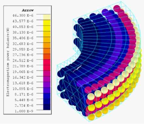 La figure ci dessous montre sous quelle forme est retranscrite la carte d'erreur pour les applications 3D. Contrairement au 2D où l'on affiche un dégradé de couleur constant par élément, on affiche ici une boule par élément volumique. Afin de mieux visualiser où se situe l'erreur, l'utilisateur aura sans doute à modifier la densité de boule qui est affichée ainsi que l'échelle de l'affichage.