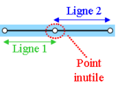 * Pour les lignes de type segment, il n'est pas obligatoire que les 2 segments soient dans la même direction. Dans ce cas, la simplification aboutit à un seul segment entre les 2 points extrémités libres de chacun des segments initiaux.
