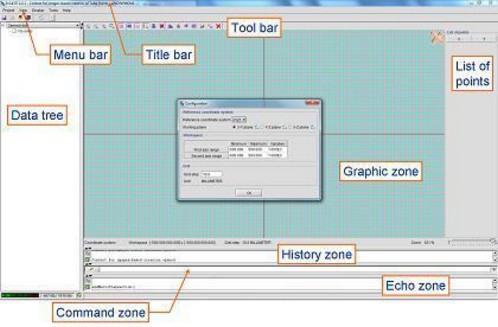 La partie centrale est occupée par la zone graphique ( Graphic zone en version anglaise), alors qu'en bas l'utilisateur peut reconnaître l'historique ( History zone en version anglaise) et les zones de commande et d'écho ( Echo and Command zones en version anglaise).