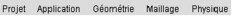 Accès aux différents menus : Projet, Application, Géométrie, Maillage, Physique |