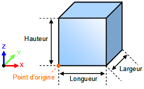 - Les dimensions du bloc (longueur, largeur, hauteur) appliquées dans le repère actif
