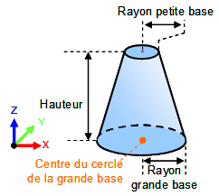 - Les dimensions du cône (rayon de la grande base, rayon de la petite base et hauteur) appliquées dans le repère actif