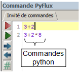 Vous pouvez entrer une ligne de commande PyFlux / Python directement dans la zone Commande, la réponse est alors affichée dans la zone Historique.