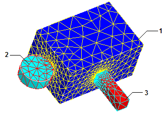 Dans l'exemple ci-dessous, les volumes 2 et 3 sont très proches du volume 1 mais ne le touchent pas. Les zones où les volumes sont presque en contact vont être maillées plus densément.