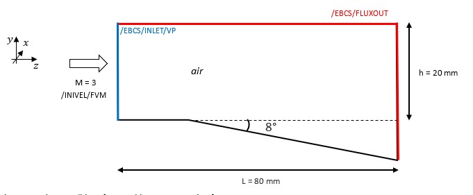 A supersonic wind tunnel (80 mm length, 20 mm height) is filled with a supersonic flow (M=3) of air.