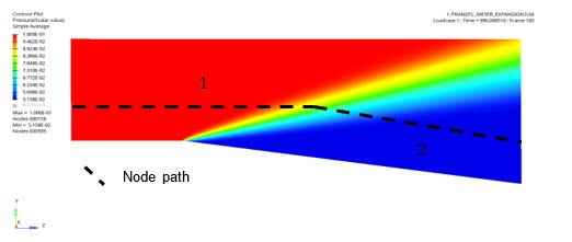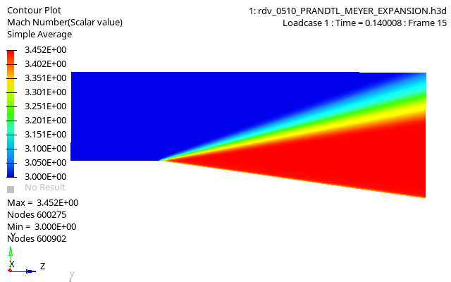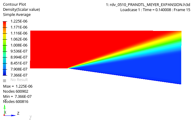 Supersonic flow is modeled using a /MAT/LAW6 hydrodynamic fluid law with an ideal gas equation of state (/EOS/IDEAL-GAS). This material is then referenced by the multi-fluid material /MAT/LAW151 (MULTIFLUID) which uses the finite volume solver. An expansion fan forms as the flow goes around a convex corner.