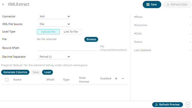 1. On the New Data Extract page, select Xml in the Connector drop-down list.