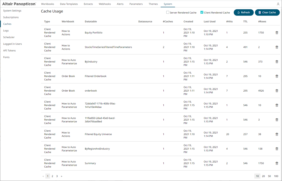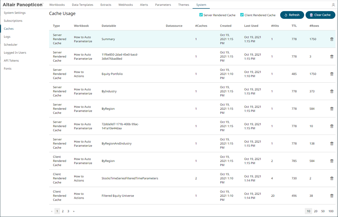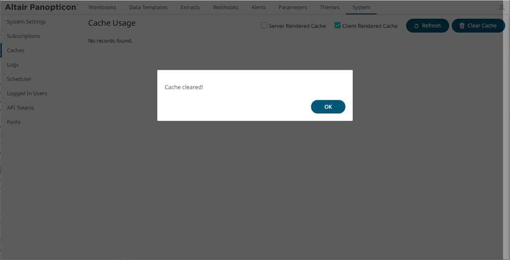 Clicking Clear Cache  will clear all caches of data, ensuring that any subsequent workbook access that utilizes a cache, will cause a cache reload.