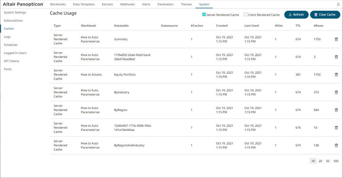 Checking the Server Rendered Cache box displays the list of server-rendered caches.