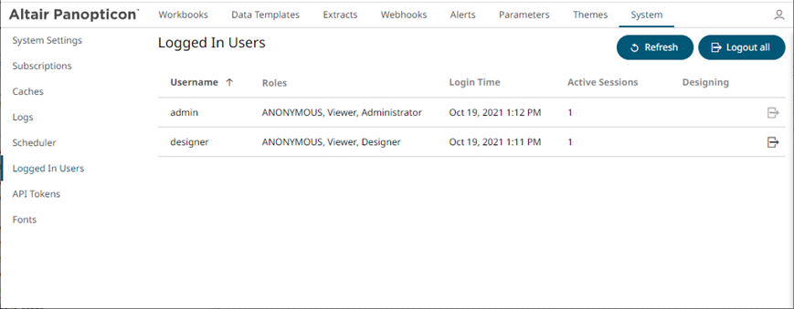 On the System page, click the Logged In Users tab. The list of logged in users is displayed.