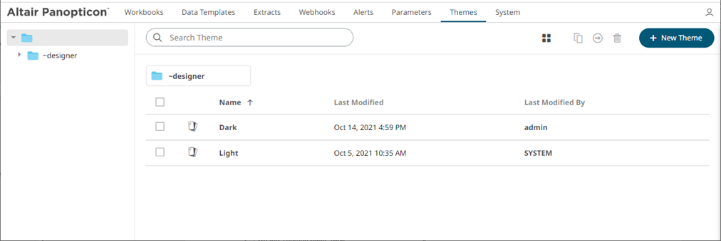 The Theme tab allows management of these workbook themes which are stored in the repository on the server.