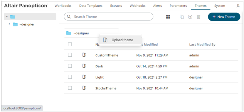 1. Click on a folder of subfolder where the user has permission to upload a theme then select Upload Theme on the context menu.