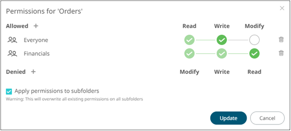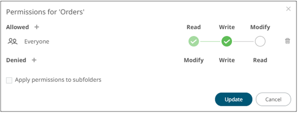 The Apply Permissions to Subfolders: · is only enabled when there is an existing subfolder. · does not affect the personal folders.