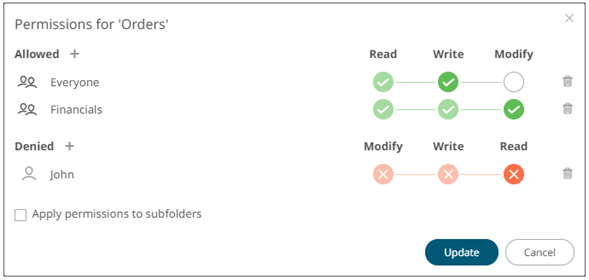 · leave the Apply Permissions to Subfolders boxunchecked and modify the permission properties of the subfolders