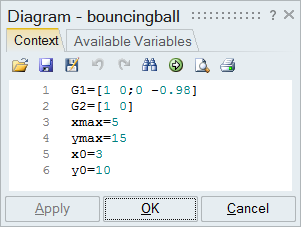 Diagram Contextタブには、ブロックパラメータの定義に使用するスクリプト内の変数を定義するためのOMLテキストエディターが含まれています。OMLライブラリ内のすべてのOML関数をスクリプトで使用できます。そのスクリプトで定義されたすべての変数はダイアグラムのスコープ規則に支配され、そのダイアグラムおよびその下位のダイアグラムとそのコンテキストで(これらの変数が別のコンテキストで再定義されていない限り)ブロックパラメータの定義に使用できます。