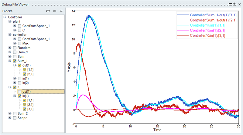 シミュレーションプリファレンスでデバッグファイルの作成オプションを選択したうえでシミュレーションを実行すると、生成された.dhdfファイルのデータをデバッグファイルビューアーで確認できます。