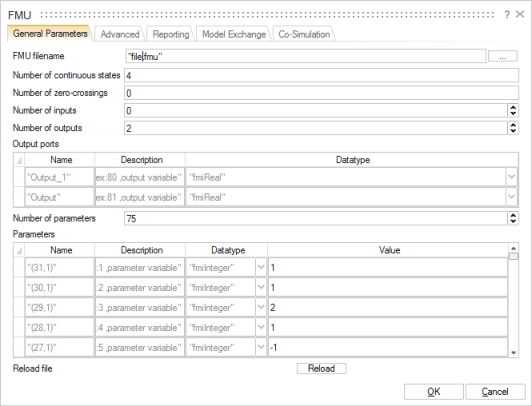 このブロックダイアログでは、FMUブロックの選択とロードが可能です。選択後は、入力数、出力数、状態変数の数などの値を各フィールドに入力するか、ReloadをクリックしてFMUブロックを読み取り、フィールドに自動入力します。パラメーターテーブルには、FMU変数変数が表示されており、その開始値は編集可能です。値の変更は、シミュレーション開始前に考慮されます。