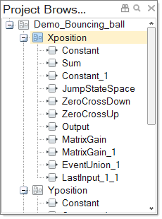 モデリングウィンドウに、スーパーブロック内部のブロックが表示されます。次のイメージは、bouncing_ballモデルのツリービューでそのレベルにあるブロックを示しています。