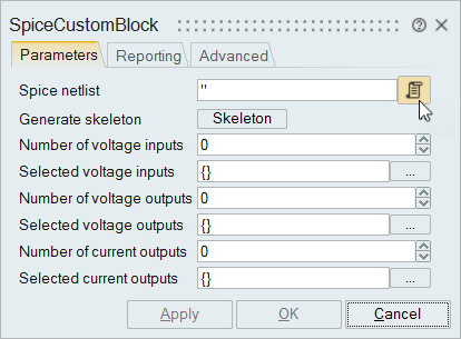 SpiceCustomBlockでは、SPICEネットリストを利用して、モデルに新しい電子部品を作成したり、モデルにある既存の電子部品を変更したりできます。このブロックは、そのポート、パラメータ、シミュレーション関数を含め、自由にカスタマイズできます。