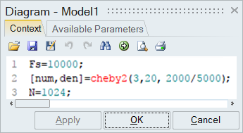 ダイアグラムのコンテキストでCheby2というOML関数を適用します。Cheby2関数によって、ローパスフィルターの伝達関数の係数が生成されます。