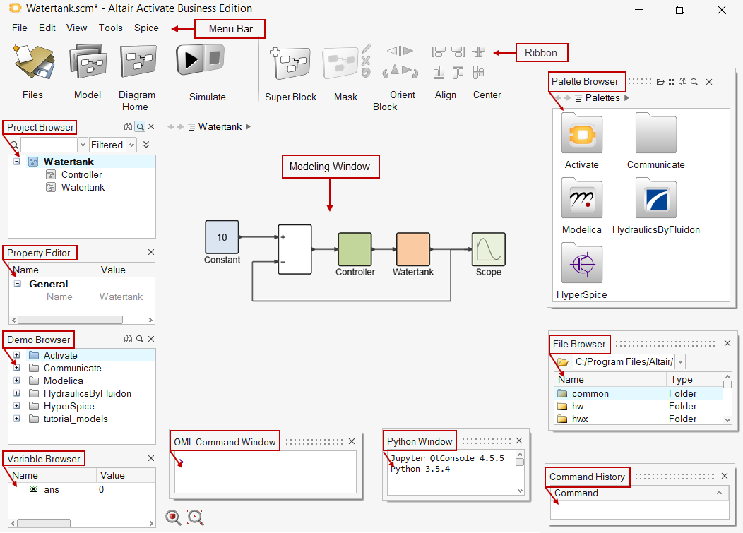 The Python command window lets you enter individual Python commands supported by the Python interpreter (3.5.4 for the current release) included with Activate.