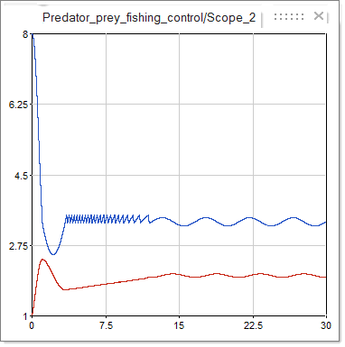 スコープブロックは、レビューするモデル内の各信号に接続します。次に示す前出の“肉食動物-獲物”モデルの例では、ダイアグラムの右側のScope_2が、時間の経過による棲息数の進展ををプロットするように定義されています。