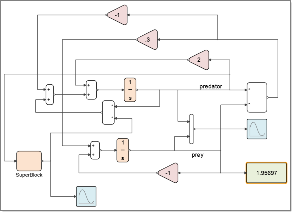 次の例では、 “肉食動物-獲物”モデルのダイアグラムを示します。Displayブロックは、ダイアグラムの右に接続され、棲息数の値を表示するよう定義されています。Displayブロックは、シミュレーションの際に棲息数が変化すると更新されます。図でハイライト表示されている値は、シミュレーションの実行の最終時間での最終値です。