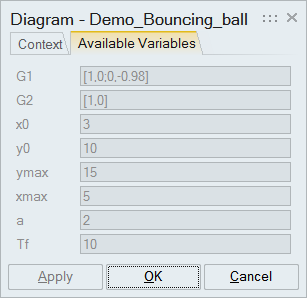 Diagram Contextタブには、ブロックパラメータの定義に使用するスクリプト内の変数を定義するためのOMLテキストエディターが含まれています。OMLライブラリ内のすべてのOML関数をスクリプトで使用できます。そのスクリプトで定義されたすべての変数はダイアグラムのスコープ規則に支配され、そのダイアグラムおよびその下位のダイアグラムとそのコンテキストで(これらの変数が別のコンテキストで再定義されていない限り)ブロックパラメータの定義に使用できます。
